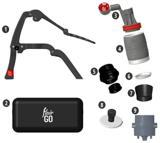 Включено във всички Flair 2GOs 1. Сгъваем Flair 2GO корпус 2. Flair 2GO Калъф за носене 3. Бутало с манометър 4. Цилиндър за приготвяне на кафе без предварително загряване Включено с модела на терена 5. Бездънен 2-в-1 портафилтър 6. Stainless steel dispersion screen ( намира се вътре в цилиндъра за приготвяне на кафе ) 7. Дозираща фуния 8. Flair 2GO Несанкционирано отваряне Включено с модела Pods 9. Портафилтър за капсули |  |