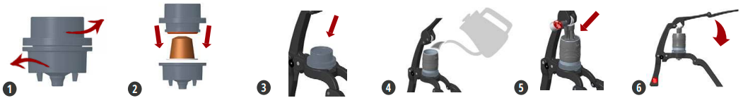 Pod Portafilter - Модел на pod-ове Приготвя се с оригинални Nespresso капсули Няма да работи с Vertuo или K-Cup капсули! Вашият капсул Portafilter има две половини, горна и долна, които се въртят една от друга. Горната част има вградена камера за капсули, а долната има решетка за разкъсване на фолиото. Пригответе всякакъв размер на дозата между 20-50 мл, като добавите повече или по-малко вода до линията за максимално пълнене. |  |