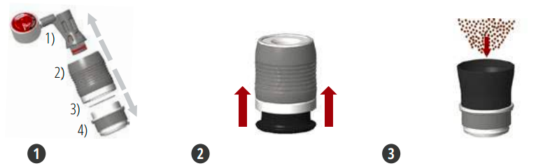 1. Разделете главата за приготвяне на кафе - Разделете я на четири части: 1) Бутало 2) Цилиндър за приготвяне с бутало 3) Сито 4) Портафилтър.