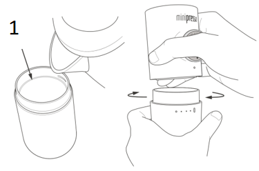 Напълнете резервоара за вода според риска. Подравнете тялото на вашия MiniPresso с точката на резервоара и го поставете върху резервоара, като го завъртите по часовниковата стрелка.